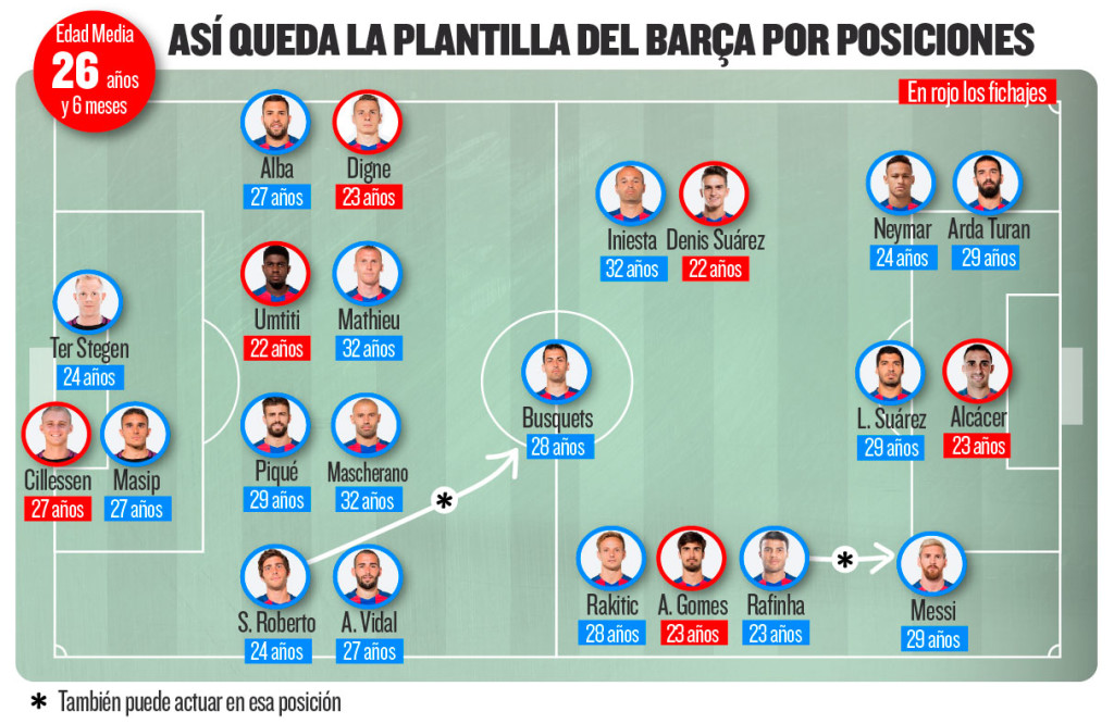 سرمربی بارسا با داشتن ۲۲ بازیکن، تقریبا در همه پست ها جانشینانی مناسب برای مهره های اصلی و ثابت خود در اختیار دارد. میانگین سنی این تیم نیز ۲۶ سال و ۶ ماه است و آبی اناری ها جوان تر از فصل قبل شده اند.