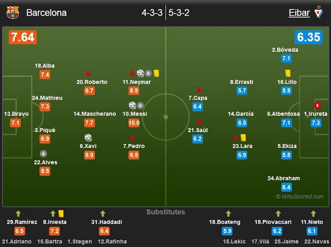 دقیقه ۷۴: لئو مسی با همکاری زیبای خود با نیمار به قلب دفاع ایبار زد و با یک ضربه زمینی به گوشه سمت چپ دروازه اولین گل خود در این مسابقه را نیز به ثمر رساند.